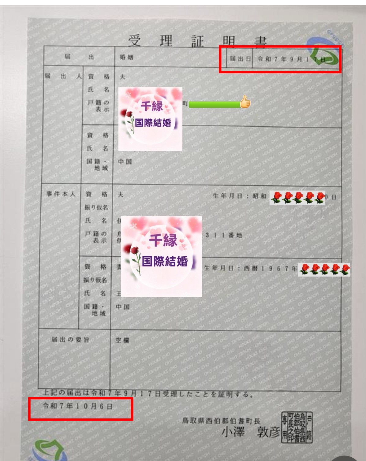 中国57歳大連市な女性と日本鳥取県68歳男性ご成婚おめでとう御座います♪㊗️🎊